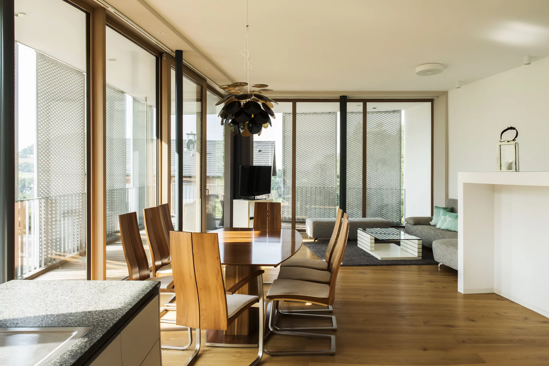 Die raumhohen Verglasungen holen die Weite des Tals direkt ins Innere. Innen- und Außenraum verschmelzen, Licht und Landschaft werden Teil des täglichen Lebens. Schiebeläden aus Streckmetall dienen als flexibler Sonnen- und Sichtschutz und verleihen dem Haus zugleich eine elegante, moderne Fassade.