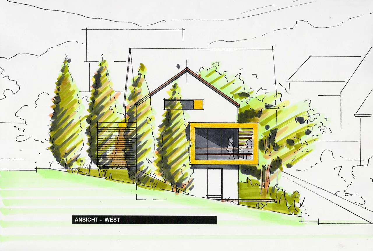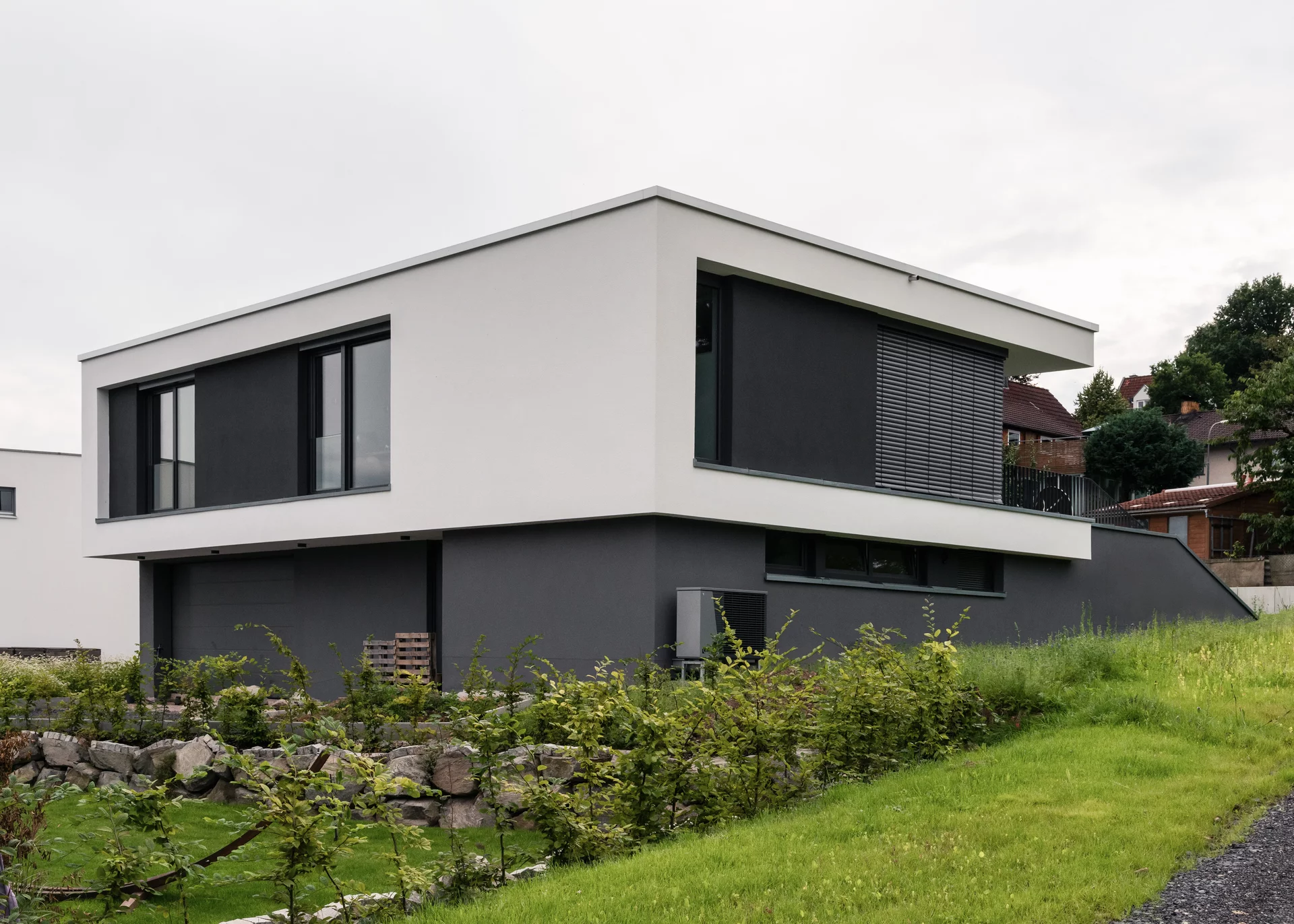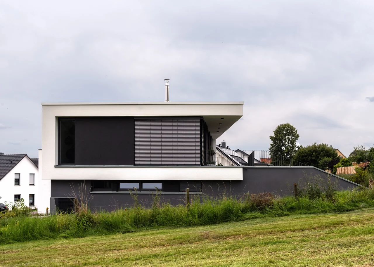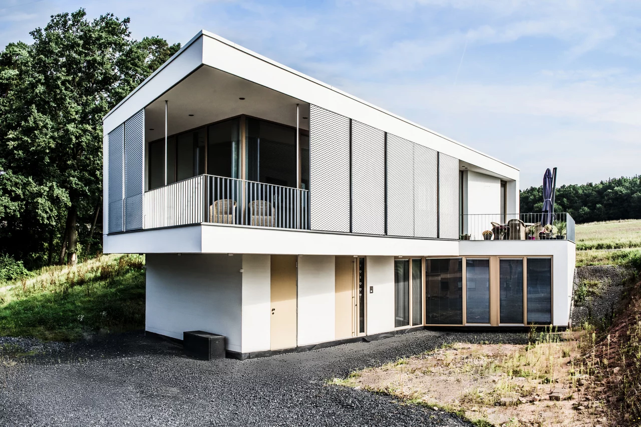 Mit diesem Wohnhaus am Neuenberg über Fulda wurde ein echter Blickfang geschaffen – architektonisch wie ökologisch. Die Holzständerbauweise mit Zellulosedämmung sorgt für Nachhaltigkeit und hervorragende Energiewerte, während geschickt eingesetzte Stahlstützen dem Obergeschoss eine fast schwebende Leichtigkeit verleihen.
