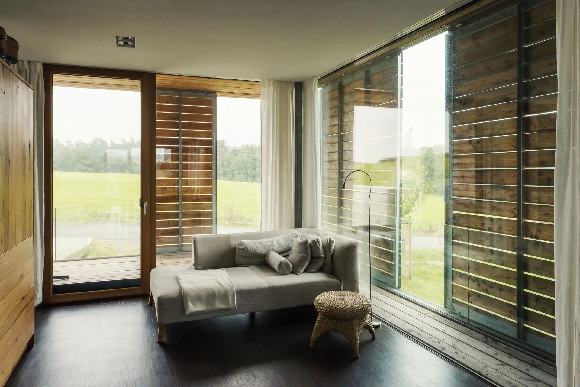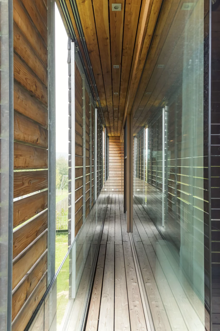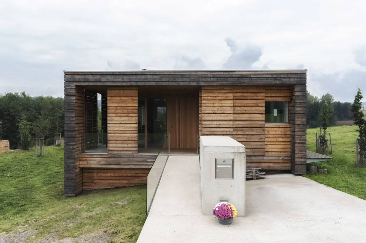 Das Wohnhaus zeigt, wie vielfältig Holz eingesetzt werden kann: Die Holzrahmenbauweise bildet die Grundlage, während die vollständig verglaste Sonnenseite maximale Offenheit schafft. Halbtransparente Holzschiebeläden dienen als flexibler Sicht- und Sonnenschutz und verleihen der Fassade ein lebendiges Spiel aus Licht und Schatten.