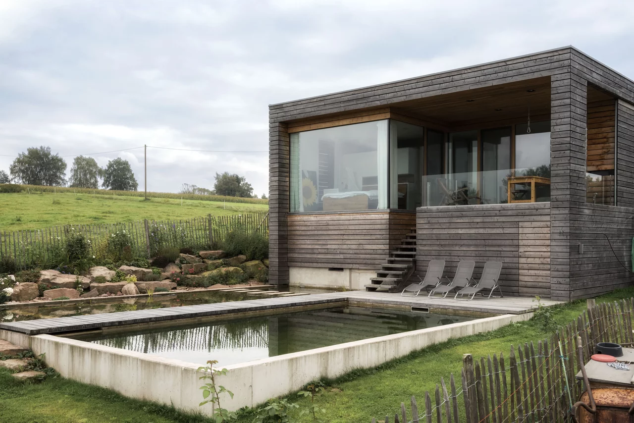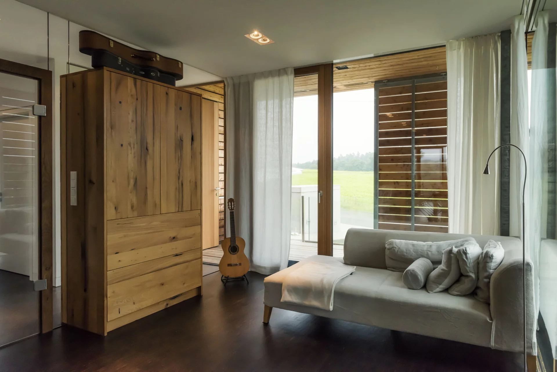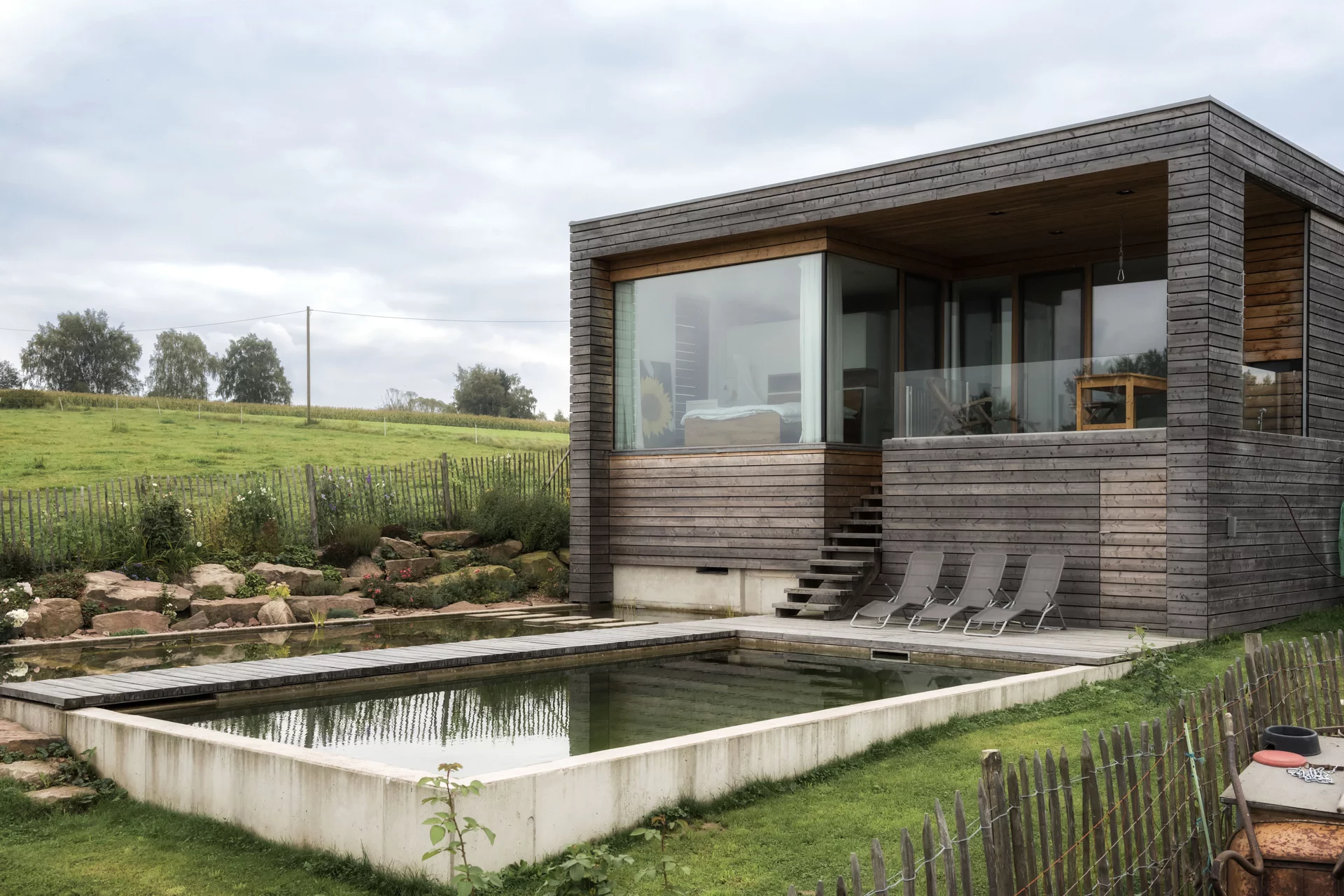 Das Wohnhaus zeigt, wie vielfältig Holz eingesetzt werden kann: Die Holzrahmenbauweise bildet die Grundlage, während die vollständig verglaste Sonnenseite maximale Offenheit schafft. Halbtransparente Holzschiebeläden dienen als flexibler Sicht- und Sonnenschutz und verleihen der Fassade ein lebendiges Spiel aus Licht und Schatten.