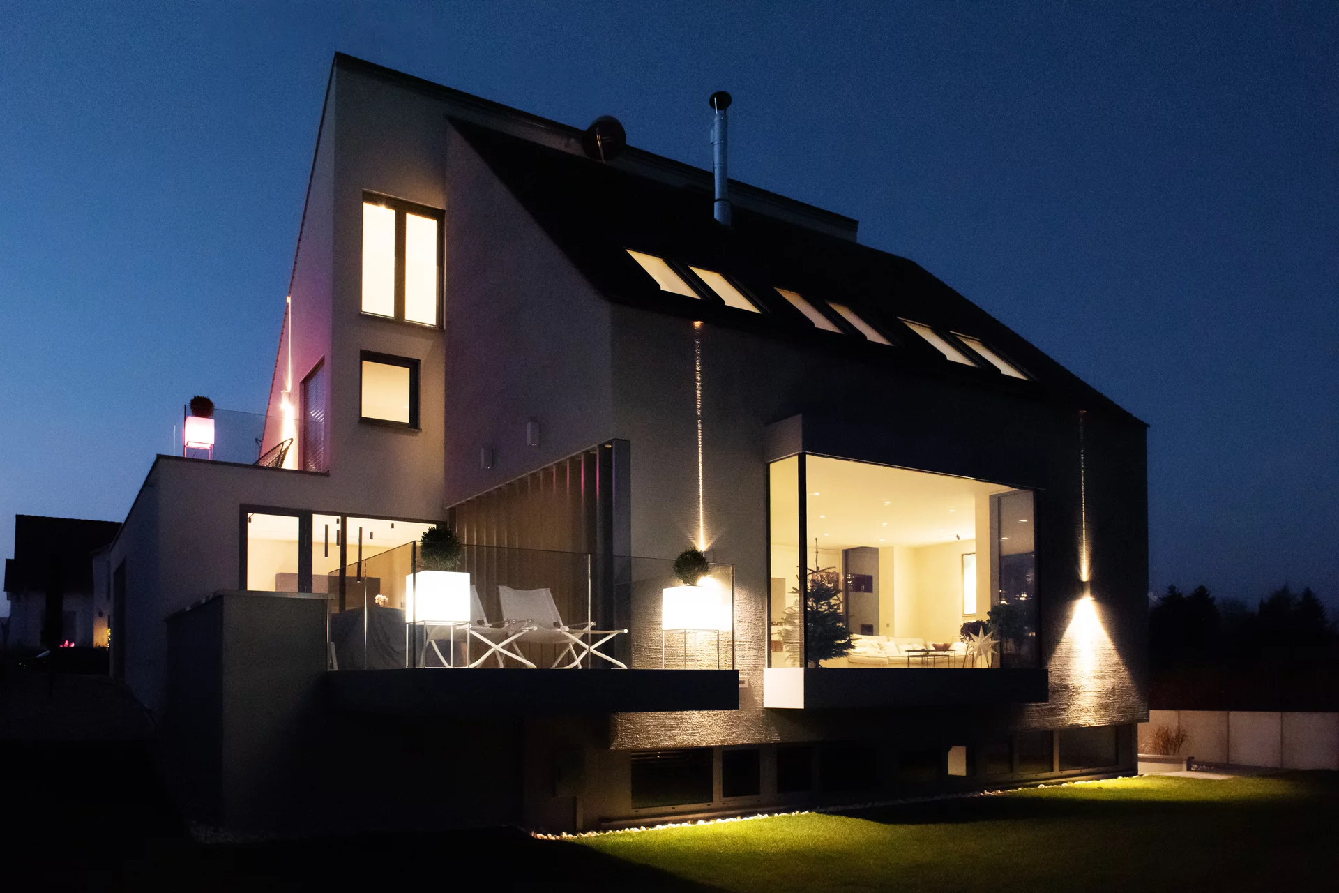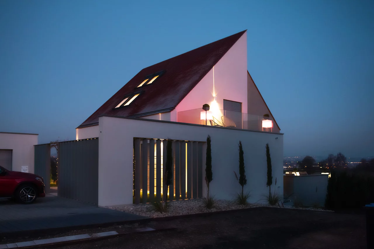 Die Herausforderung lag darin, die besonderen Gegebenheiten des Grundstücks optimal zu nutzen. Das Ergebnis: Ein Wohnhaus, das die wenigen unverbauten Blickachsen perfekt einfängt – mit Aussicht auf die Stadt Fulda und die nachts beleuchtete Liobakirche. Gleichzeitig wurde durch die clevere Anordnung der Baukörper die Privatsphäre der Bewohner gewahrt.