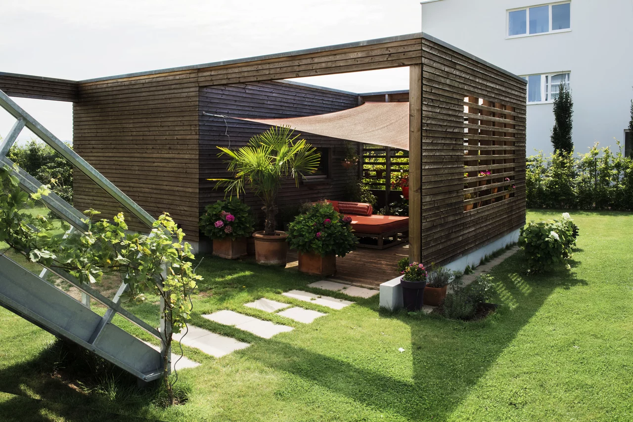 Halbtransparente Holzschiebeläden als flexibler Sonnen- & Sichtschutz