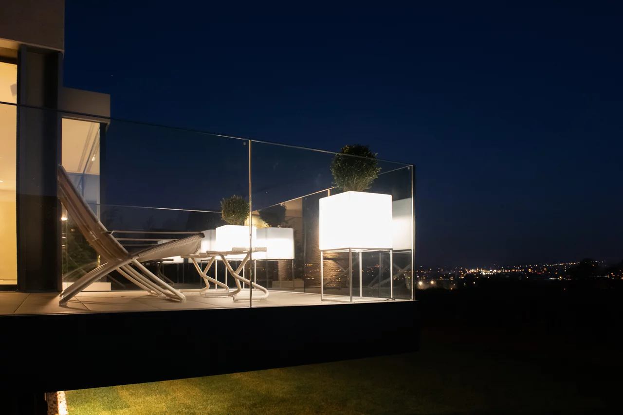 Für Privatsphäre sorgt ein vorgelagerter Bereich mit Aluminiumlamellen, der gleichzeitig einen geschützten Innenhof schafft. Dieser verwandelt sich am Abend in eine intime Oase zum Verweilen und Entspannen – mitten im eigenen Zuhause.