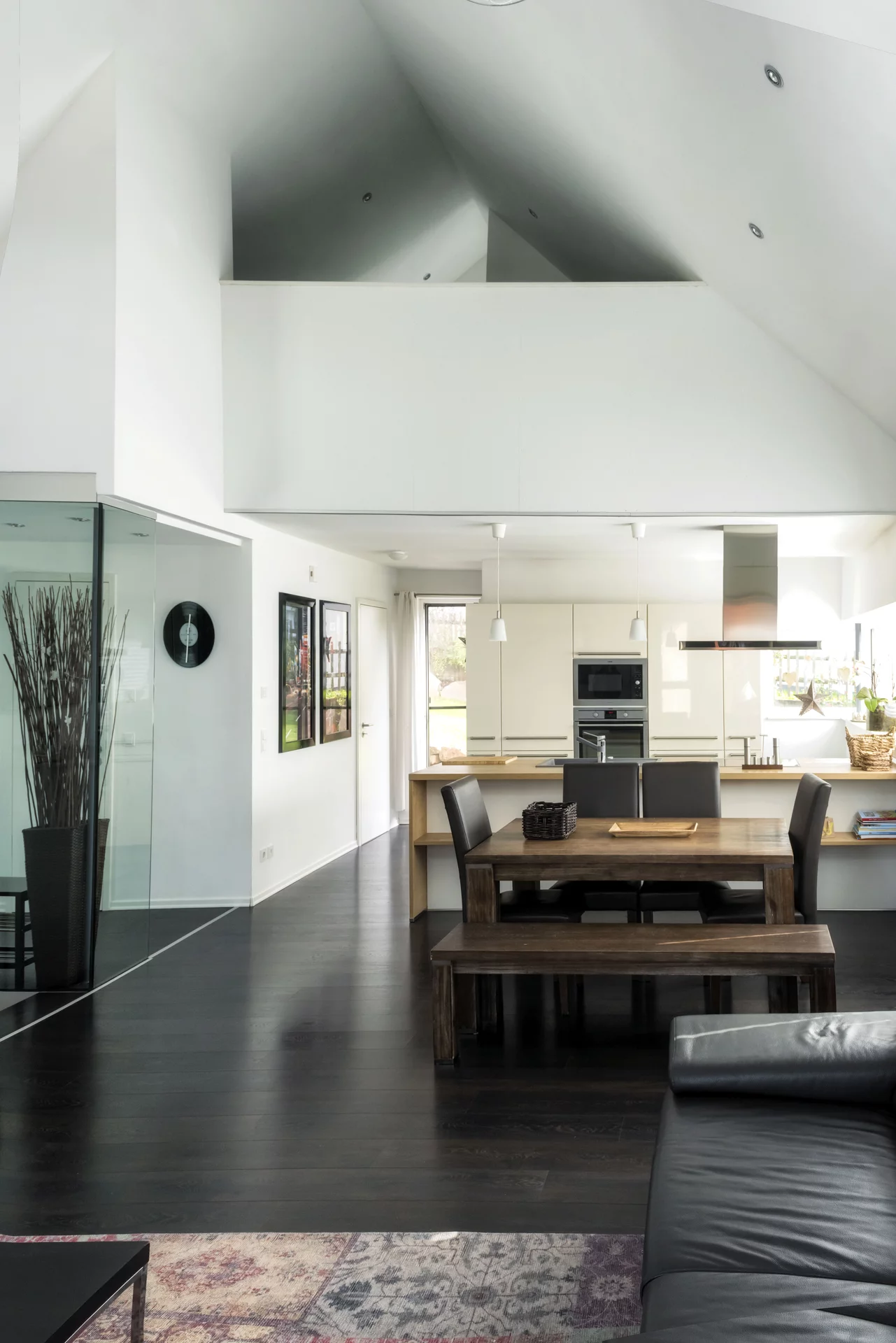 Das Herzstück des Anbaus ist ein offener Grundriss, der viel Raum, Licht und Weite schafft. Gleichzeitig überzeugt die Bauweise durch ihre ökologische Verantwortung: Der aufgeständerte Anbau in Holzbauweise mit Zellulosedämmung reduziert den ökologischen Fußabdruck und steht für nachhaltiges Wohnen im Einklang mit der Natur.
