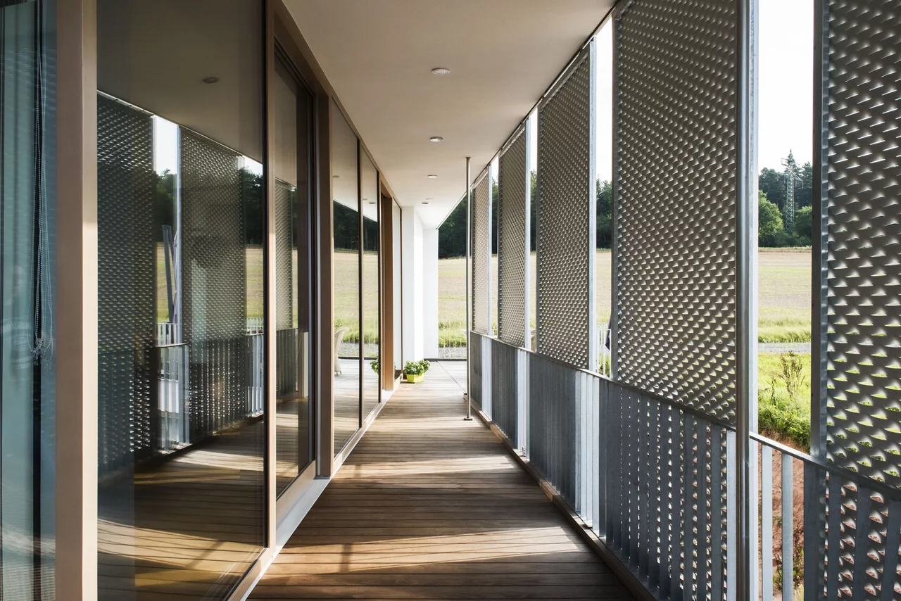 Moderne Schiebeläden aus Streckmetall als Sonnen- und Sichtschutz