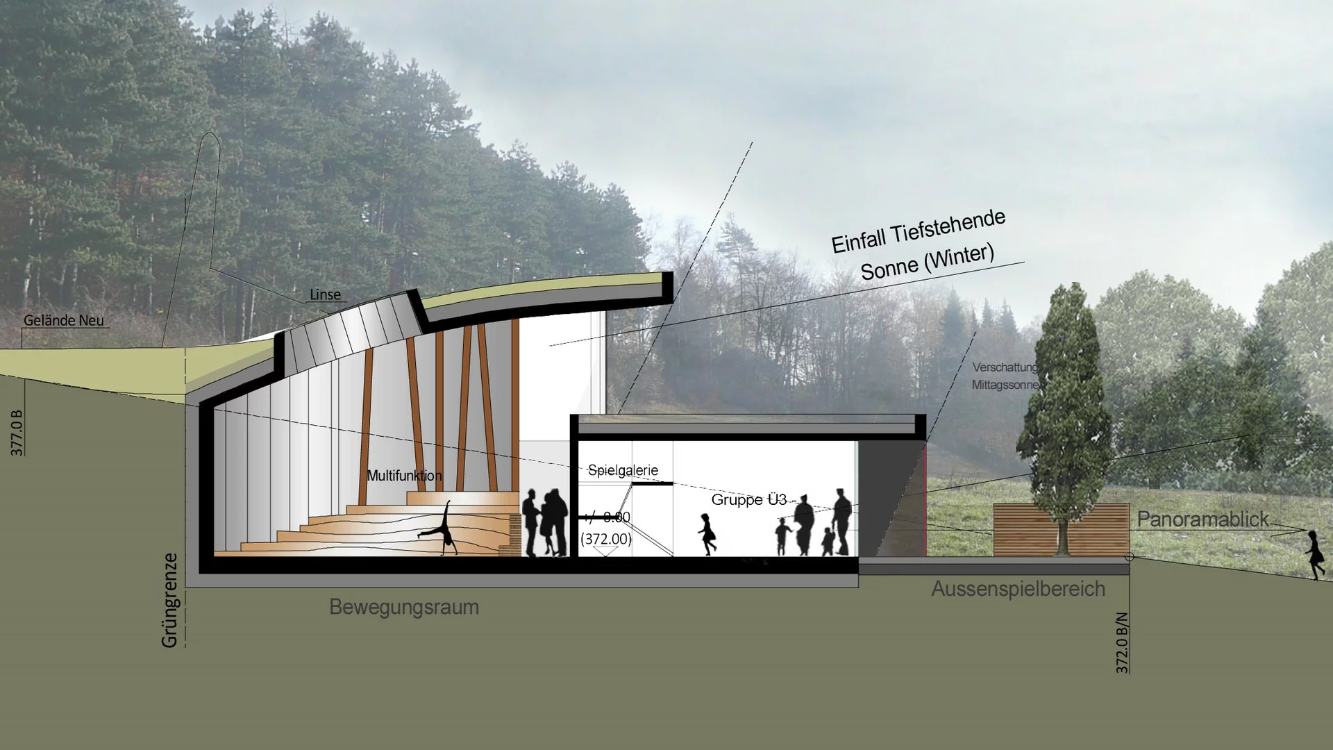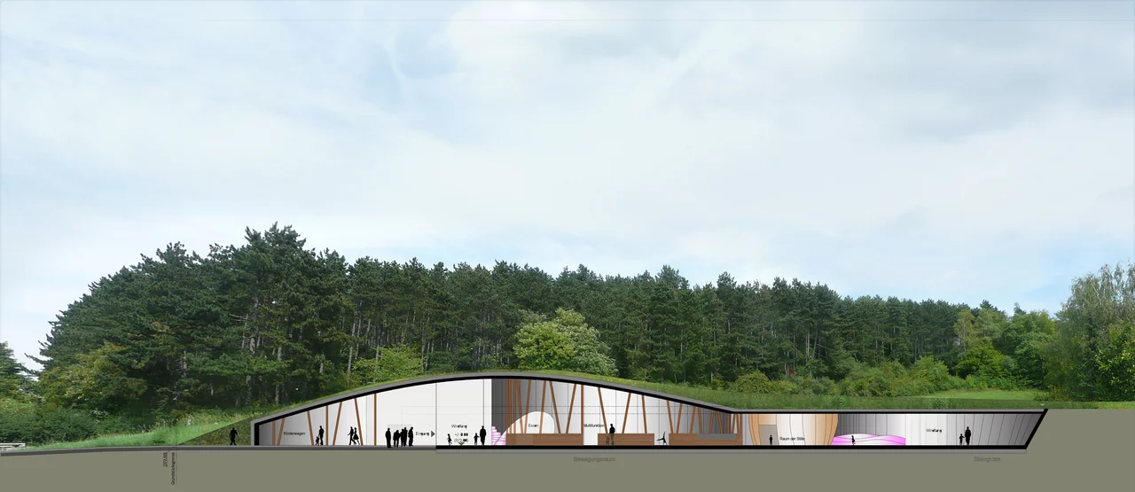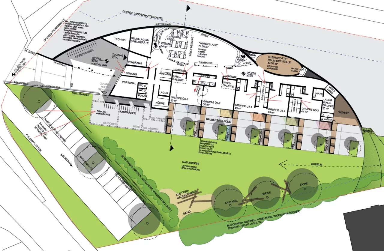Das Gebäude fügt sich harmonisch in die Landschaft ein, ohne den wertvollen Blick ins angrenzende Naherholungsgebiet zu versperren. Die Natur selbst wurde zum Leitbild des Entwurfs: Das im Erdreich sichtbare Wurzelwerk inspirierte die architektonische Gestaltung – als Symbol für das Heranwachsen, die Kraft und den Halt, den Kinder auf ihrem Weg ins Leben brauchen.