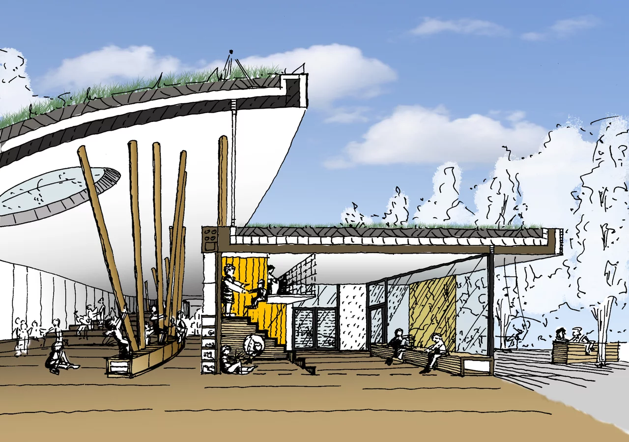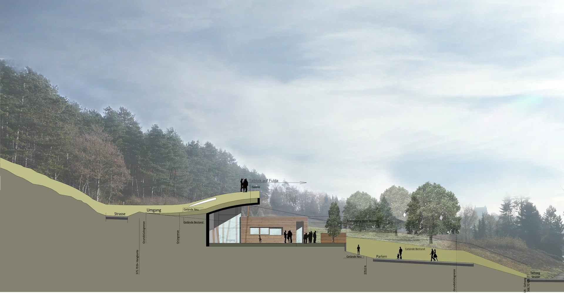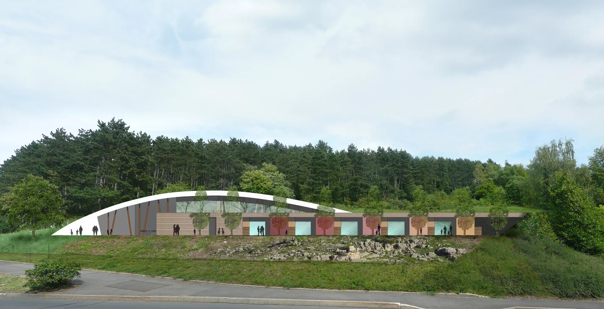 Das Gebäude fügt sich harmonisch in die Landschaft ein, ohne den wertvollen Blick ins angrenzende Naherholungsgebiet zu versperren. Die Natur selbst wurde zum Leitbild des Entwurfs: Das im Erdreich sichtbare Wurzelwerk inspirierte die architektonische Gestaltung – als Symbol für das Heranwachsen, die Kraft und den Halt, den Kinder auf ihrem Weg ins Leben brauchen.