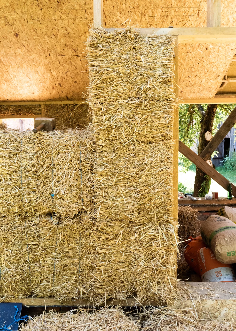Die Umsetzung beginnt mit der Ernte regionaler Strohballen. Diese werden zugeschnitten und passgenau in eine Holzrahmenkonstruktion eingefügt. Spanngurte verdichten die Ballen, kleine Fugen werden sorgfältig ausgestopft und die Oberfläche geglättet – so entsteht ein geschlossenes, stabiles System. Anschließend wird das Ganze mit Lehm- oder Kalkputz versehen, wodurch die Wände nicht nur eine natürliche Ästhetik, sondern auch ein angenehmes Raumklima erhalten.