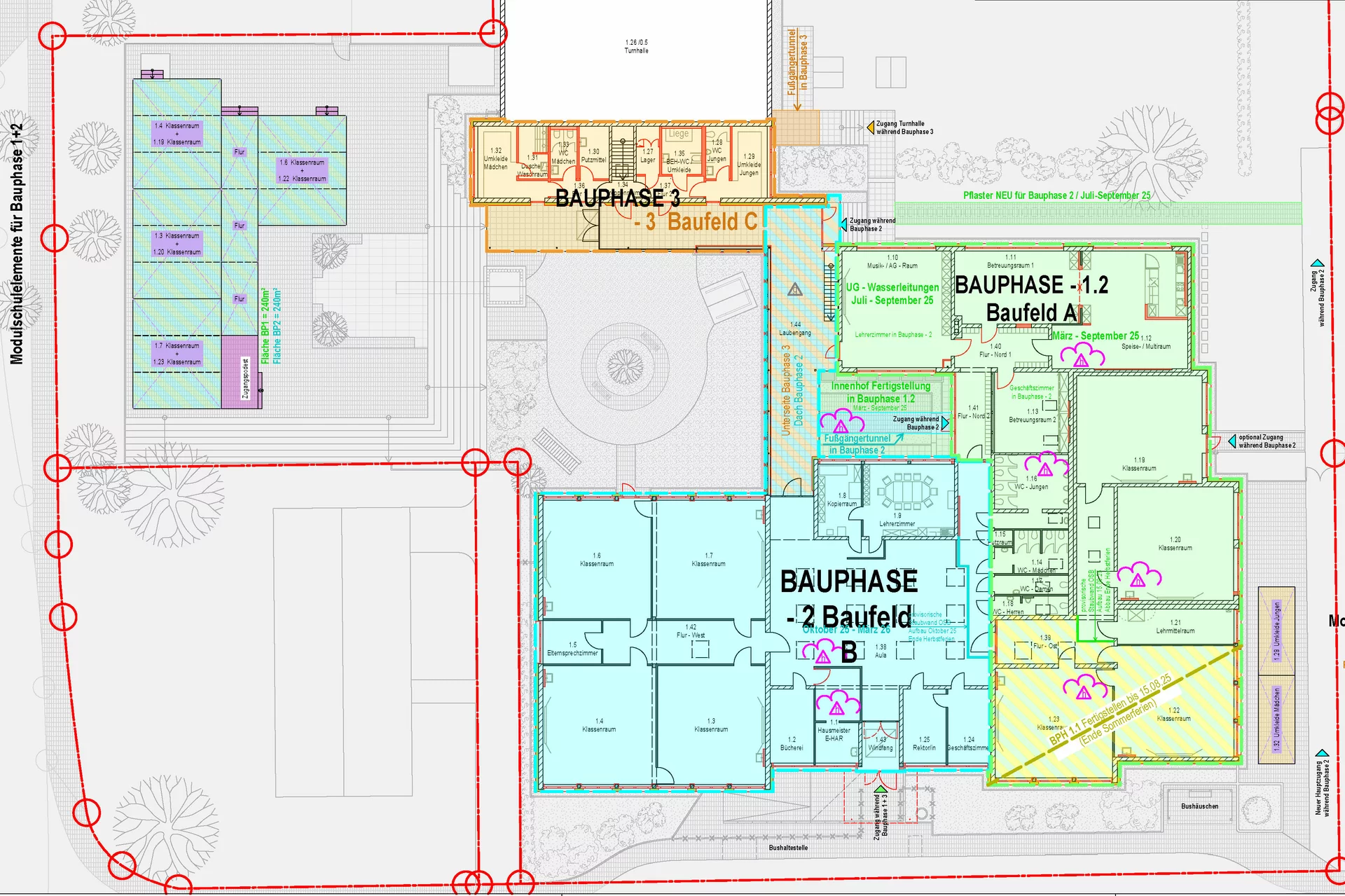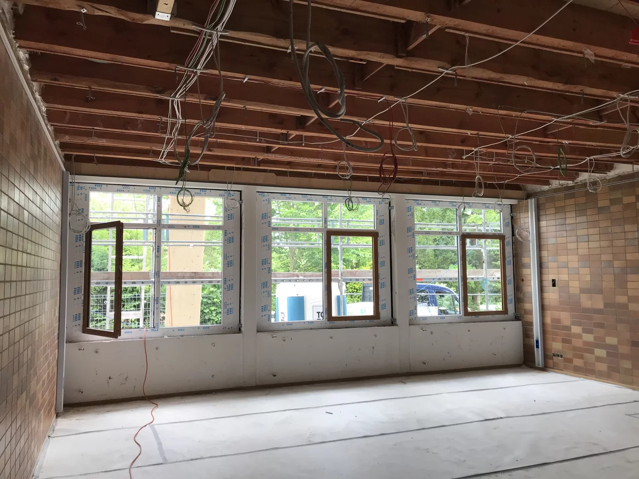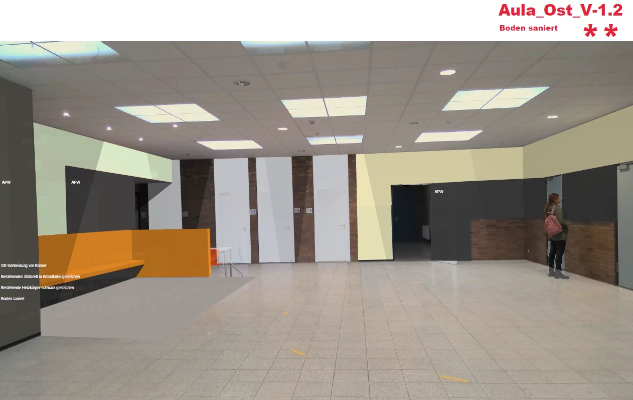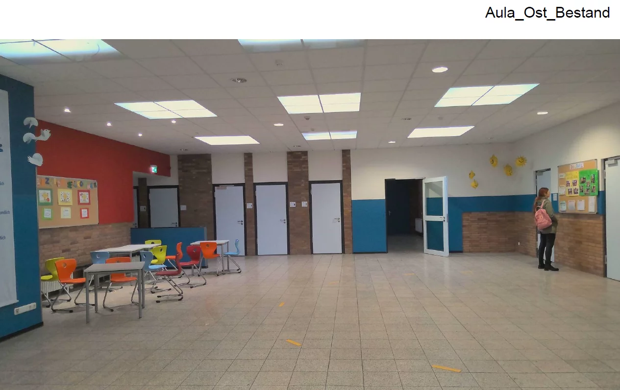 Auch technisch wird die Schule auf den neuesten Stand gebracht: mit dezentralen Lüftungsgeräten mit Wärmerückgewinnung, energieeffizienter Heiztechnik, vollständiger LED-Beleuchtung und moderner Gebäudeautomation über KNX. Präsenzmelder, Außenjalousien und eine ELA-Anlage für Durchsagen und Musik erhöhen Komfort und Sicherheit.