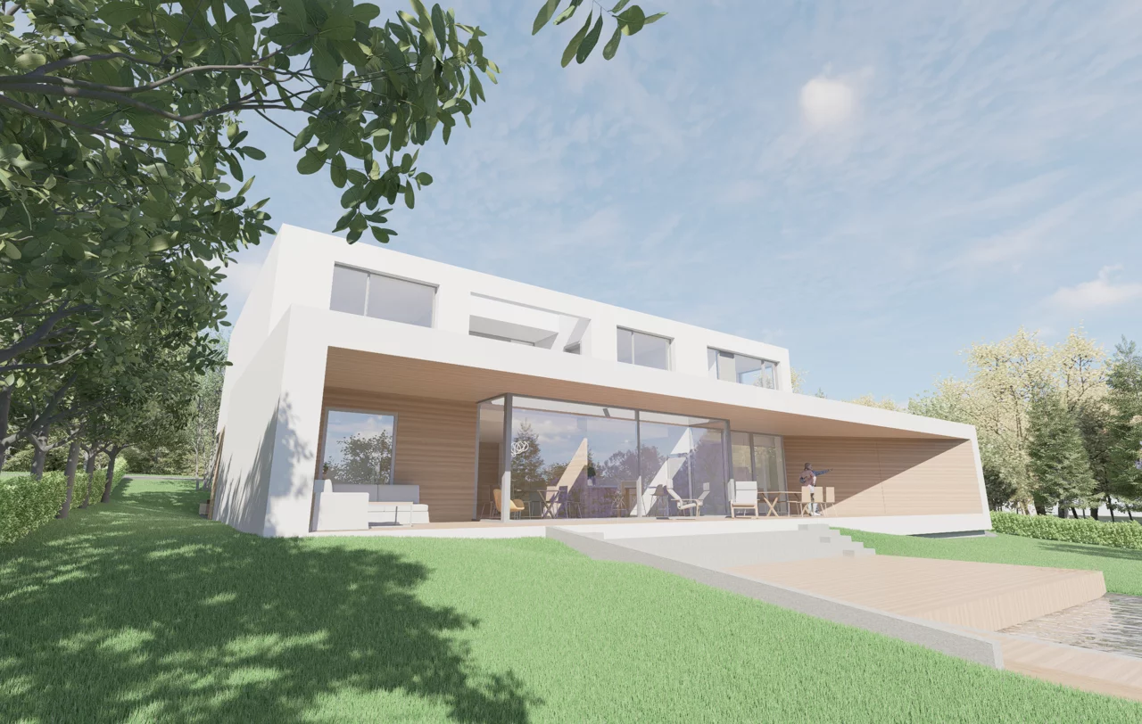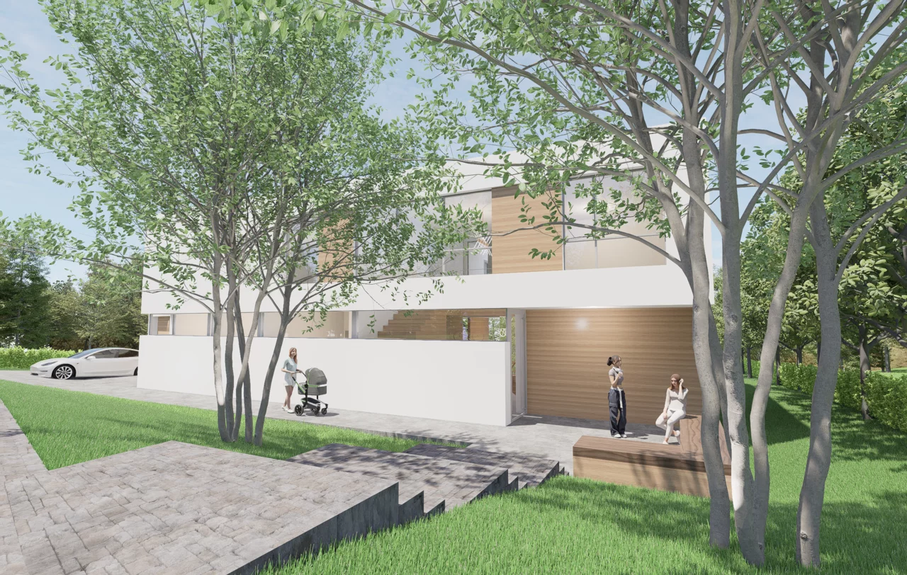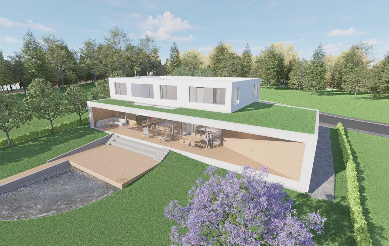 Das Herzstück ist der traumhafte Garten. Alle Wohnräume sind so ausgerichtet, dass der Blick ins Grüne jederzeit erlebbar bleibt. Gleichzeitig schützt die Anordnung entlang der Straße und die vorgelagerte Doppelgarage die Privatsphäre. Durch ein großes Schiebetor öffnet sich die Garage zum Garten hin und verwandelt sich in einen überdachten Eventbereich – perfekt für Familienfeiern und Feste, die nahtlos mit den Gartenterrassen verschmelzen.