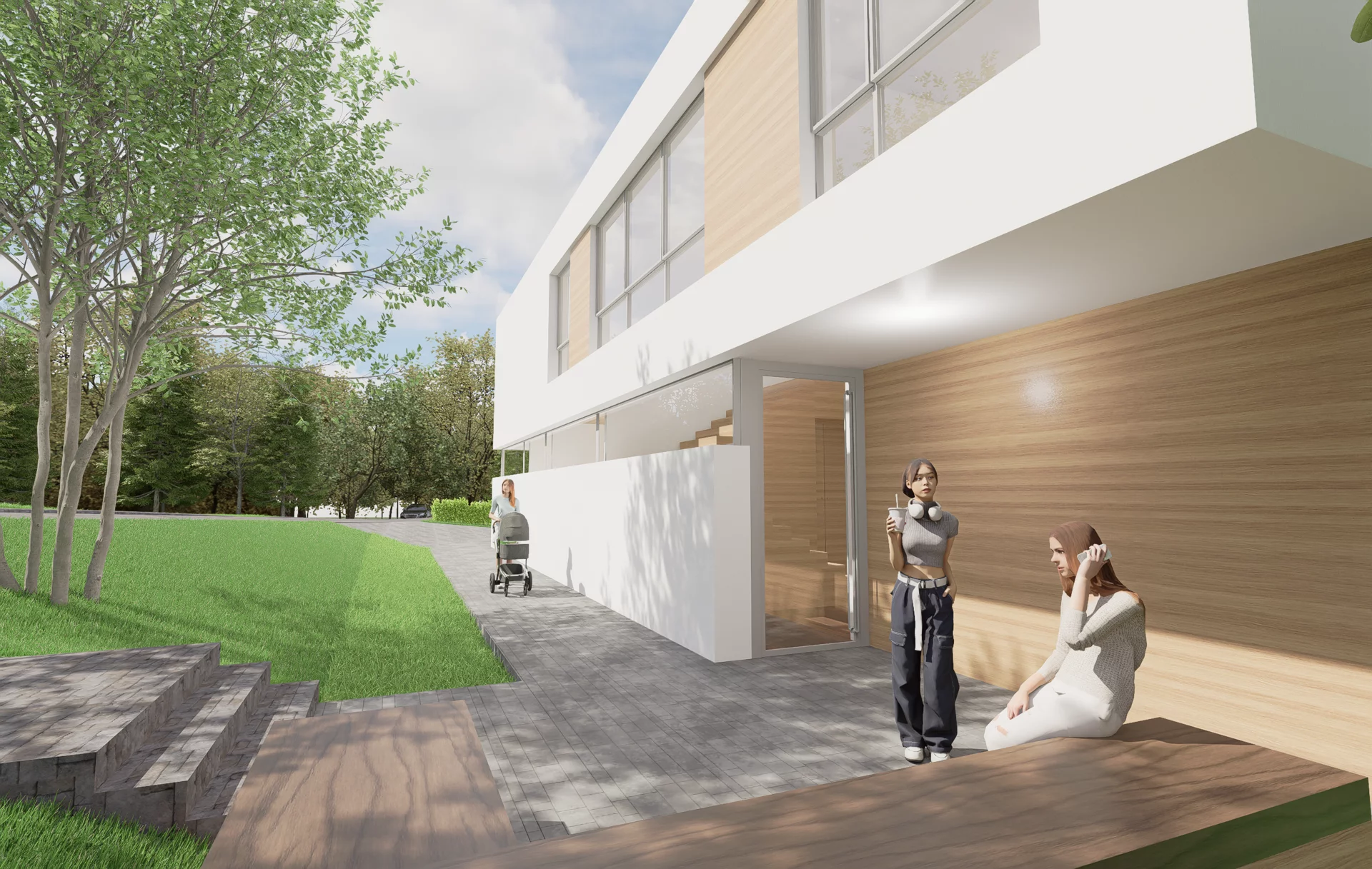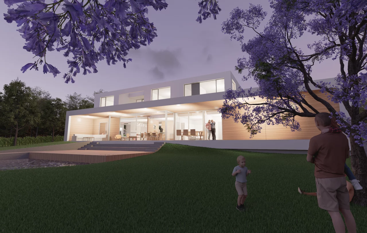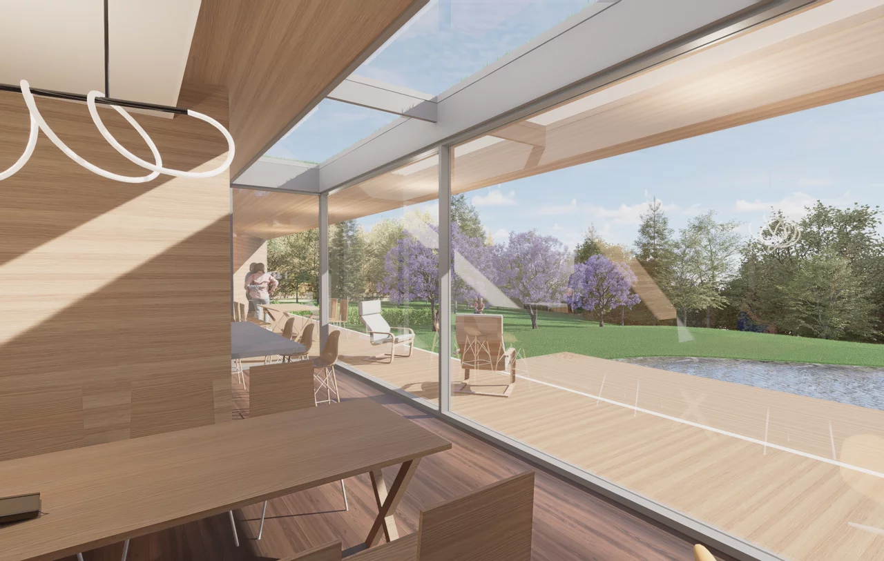 Das Herzstück ist der traumhafte Garten. Alle Wohnräume sind so ausgerichtet, dass der Blick ins Grüne jederzeit erlebbar bleibt. Gleichzeitig schützt die Anordnung entlang der Straße und die vorgelagerte Doppelgarage die Privatsphäre. Durch ein großes Schiebetor öffnet sich die Garage zum Garten hin und verwandelt sich in einen überdachten Eventbereich – perfekt für Familienfeiern und Feste, die nahtlos mit den Gartenterrassen verschmelzen.
