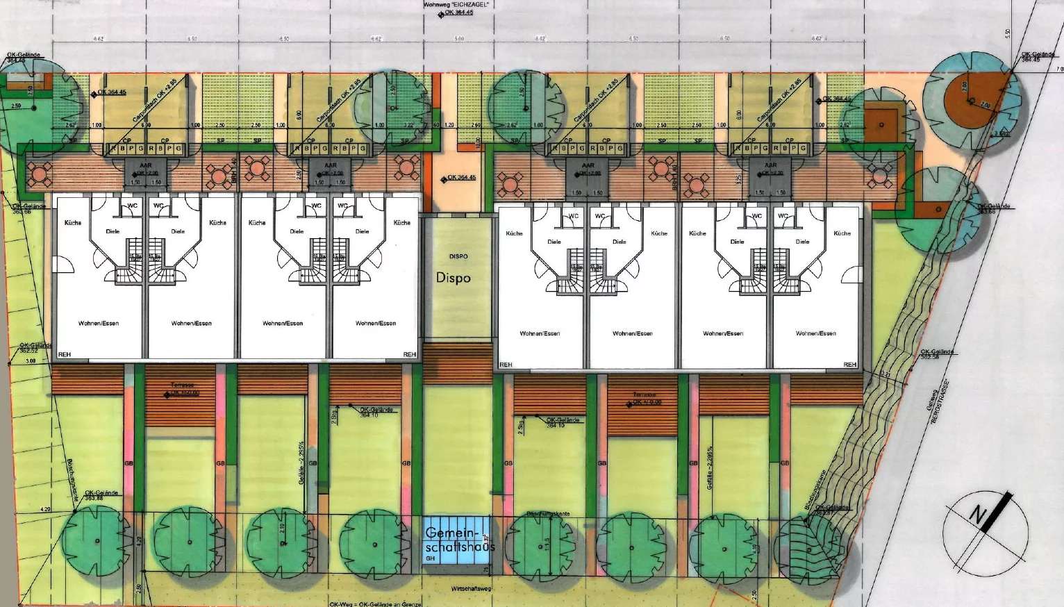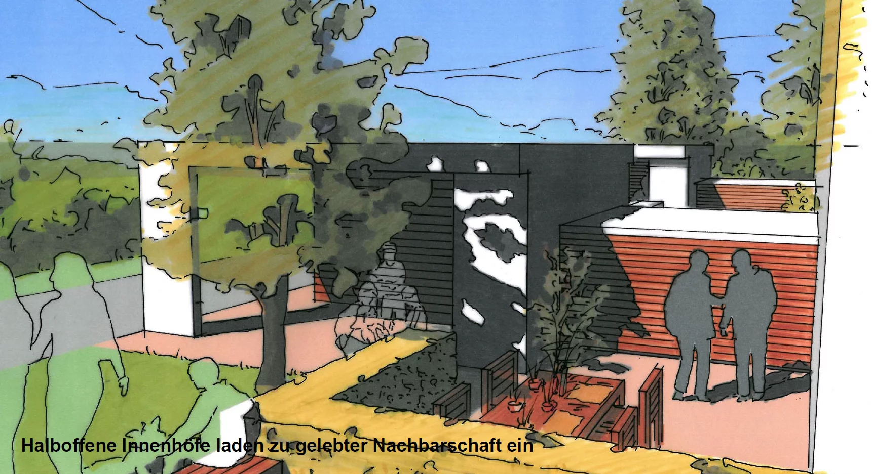 Im Zentrum des Entwurfs steht die Idee des gemeinschaftlichen Wohnens mit hoher Aufenthaltsqualität. Halbprivate Innenhöfe zwischen Haus und Carport schaffen geschützte Bereiche zum Spielen, Essen und Verweilen. Die Gärten orientieren sich nach Süden und bieten Ausblick auf die Landschaft, während vorgelagerte Grünflächen und Obstbaumalleen den Übergang zur Umgebung gestalten.