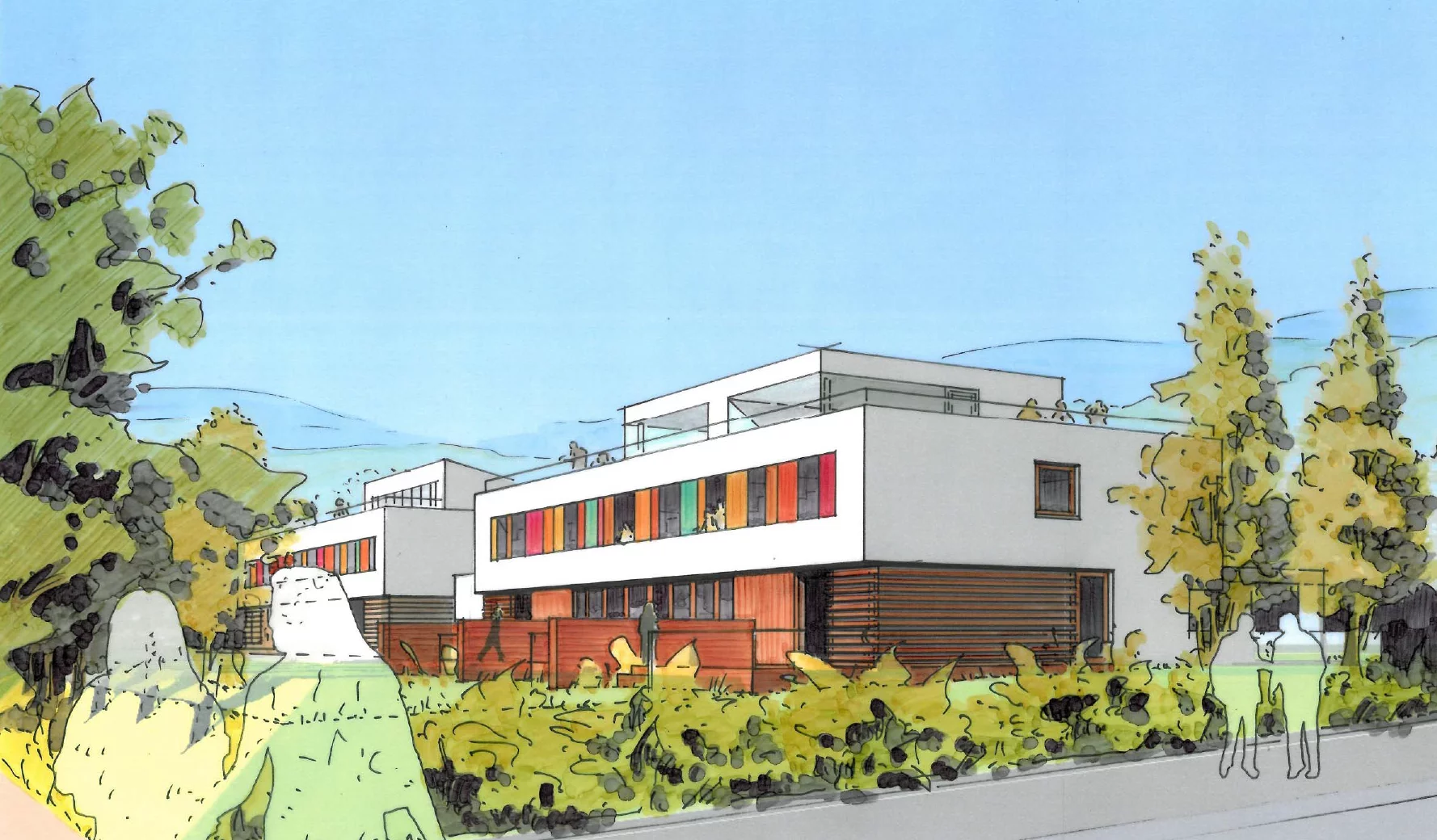 Das Gebäude fügt sich harmonisch in die Landschaft ein, ohne den wertvollen Blick ins angrenzende Naherholungsgebiet zu versperren. Die Natur selbst wurde zum Leitbild des Entwurfs: Das im Erdreich sichtbare Wurzelwerk inspirierte die architektonische Gestaltung – als Symbol für das Heranwachsen, die Kraft und den Halt, den Kinder auf ihrem Weg ins Leben brauchen.