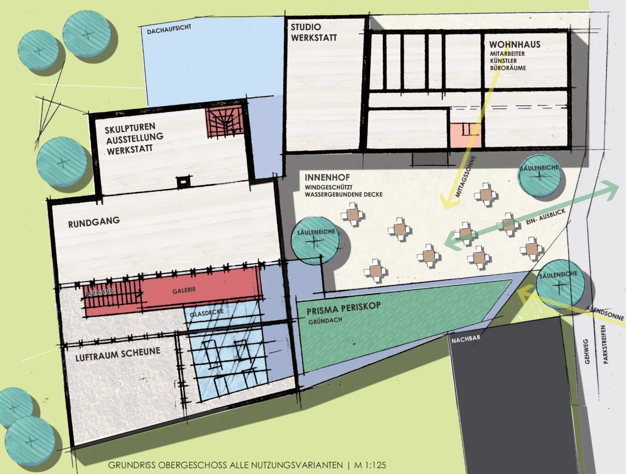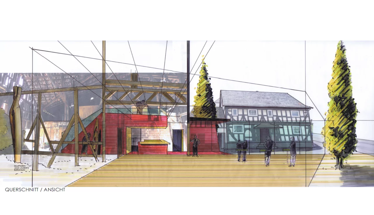 Der Innenhof wird zur bewirteten Freifläche, eingerahmt von Fachwerk und Grün, während die rückwärtige Streuobstwiese als Skulpturengarten oder Veranstaltungsfläche genutzt werden kann. Das Wohnhaus kann weiterhin als Wohnraum oder Büro dienen, alternativ auch als Funktionsgebäude für Küche, Personalräume oder Werkstätten.
